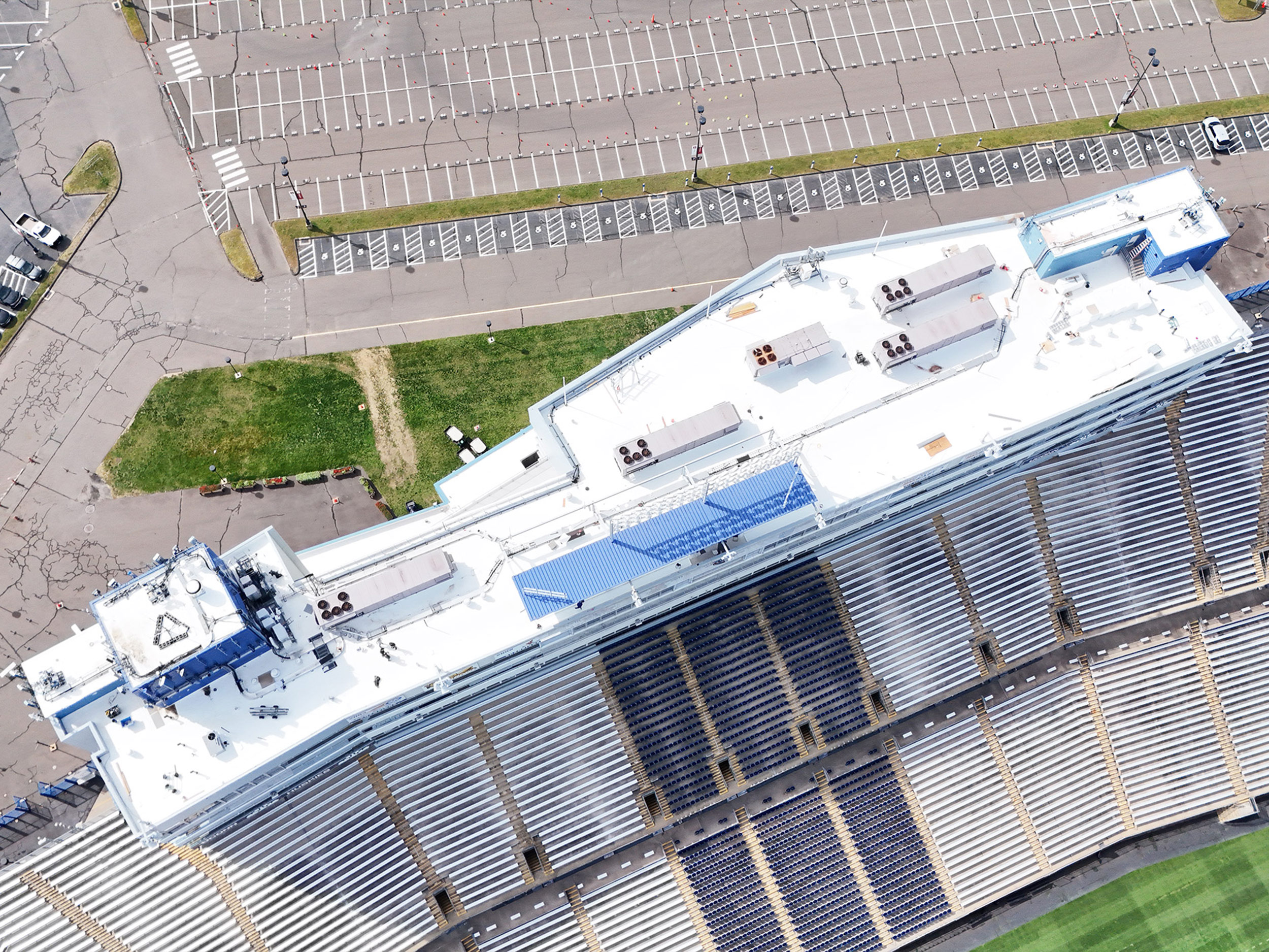We also re-roofed the lower Field Tower and eight surrounding buildings, totaling 375 squares of fully adhered Elevate .80 mil TPO. The result—a clean, efficient, and long-lasting roofing system backed by a 20-year Elevate warranty.
